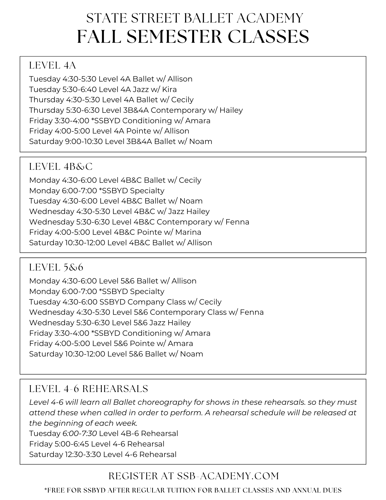 *There are no refunds for missed classes or performance fees. Most of our classes at these levels are full, so enrollment in a class prevents others from enrolling.